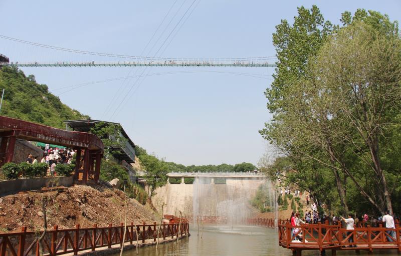瀑布噴泉飛珠玉,玻璃長(zhǎng)橋架云端。