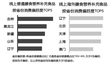 《研究》顯示,在吉林、黑龍江、山東、遼寧等北方省份,線上膳食補充相關(guān)的海外品牌和國內(nèi)品牌均受到了熱烈的歡迎,可見他們膳食營養(yǎng)品補充意識相當高;相比之下,作為一線城市的北京、上海、澳門則更多地將目光投向海外品牌。其中,值得注意的是新疆人民在線上膳食營養(yǎng)品的消費也表現(xiàn)不俗,基于新疆的整體消費實力,他們對保健品的聚焦度可見一斑。